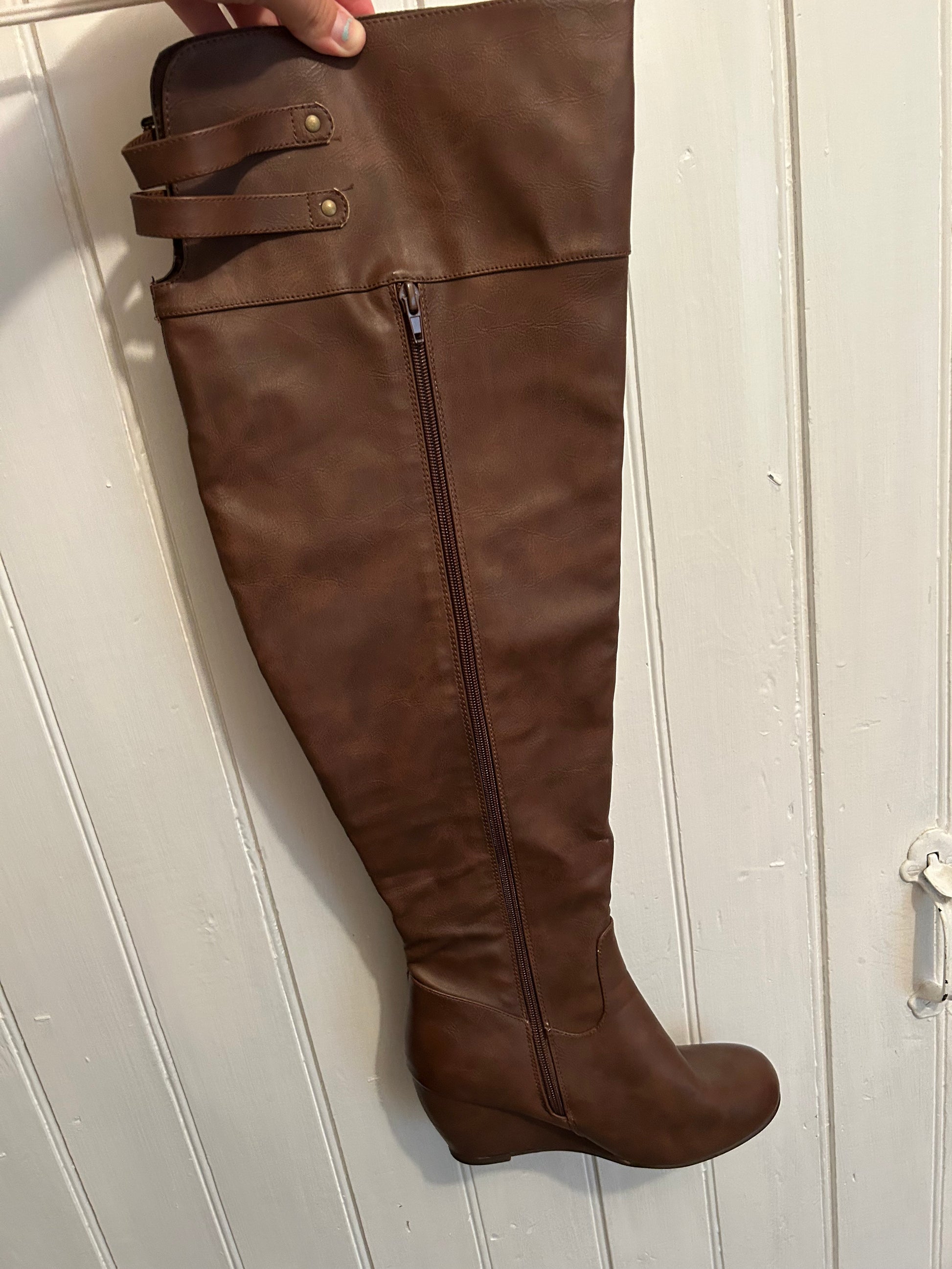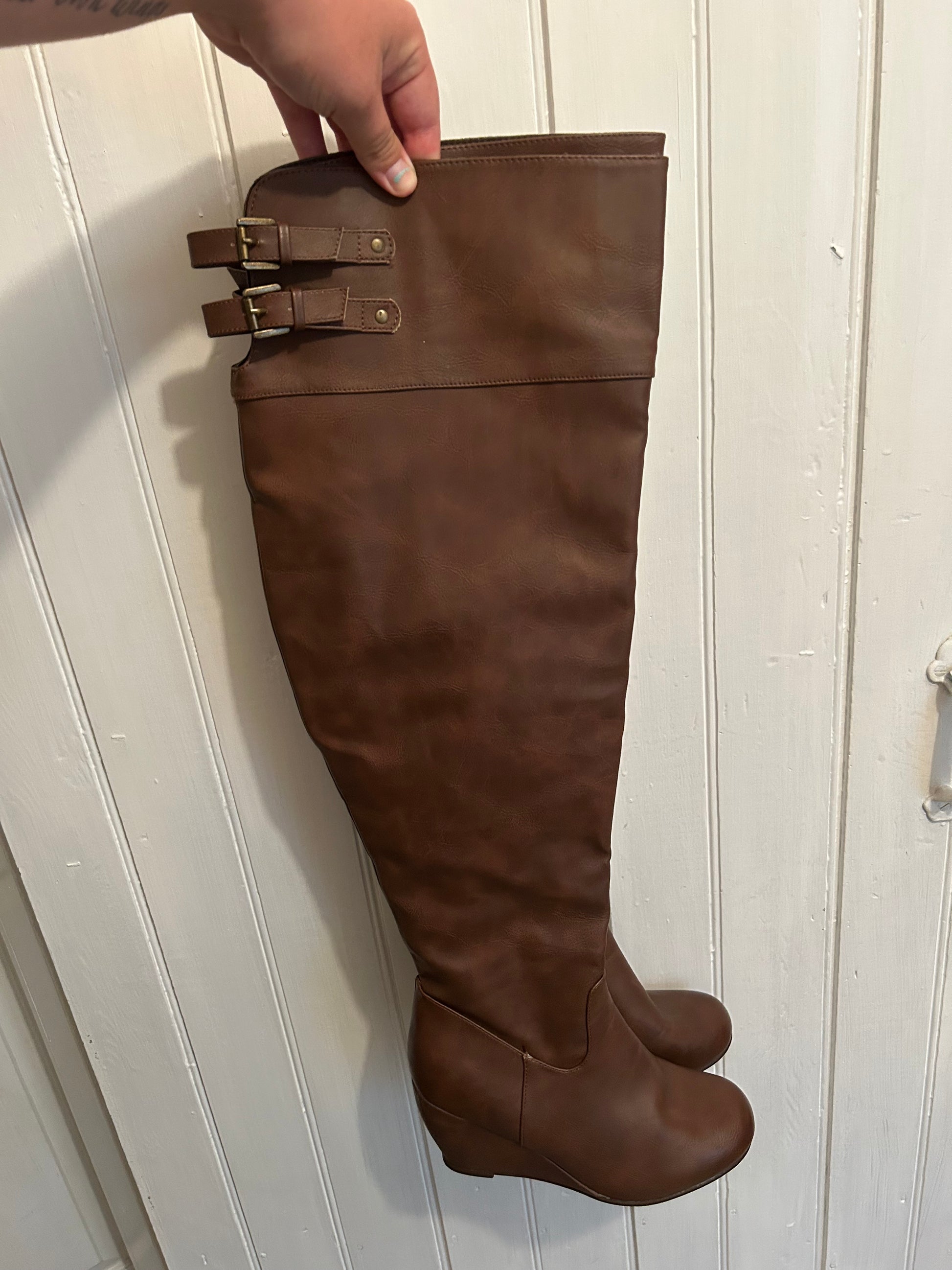 Ardene brand. Knee high wedge heeled boots. Brown in colour. Size women’s 10, thinner calf. Brand new condition
