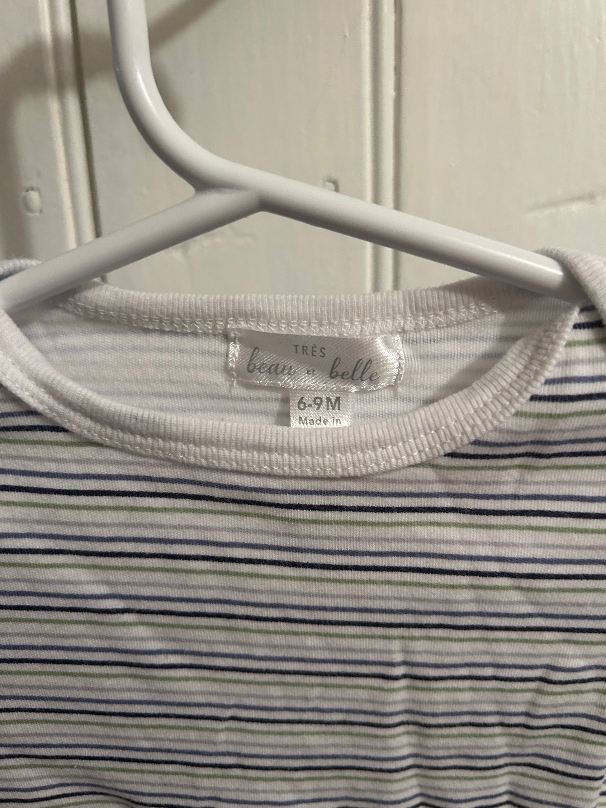 Beau & Bella brand. Long sleeve onesie. White with green & blue stripes. Size 6/9m. Brand new conditionÂ