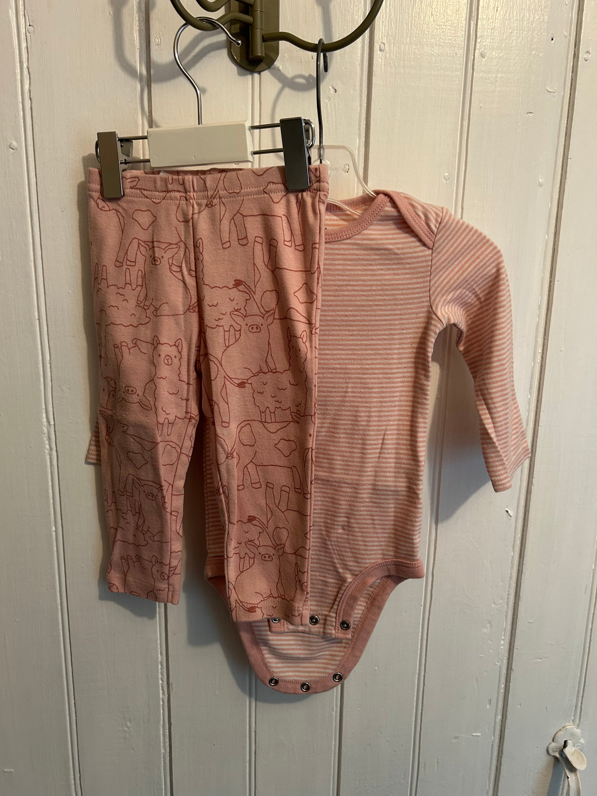 Carters brand. 2pc matching set of long sleeve pink striped onesie and pink farm animal leggings. Size 12m. Brand new condition