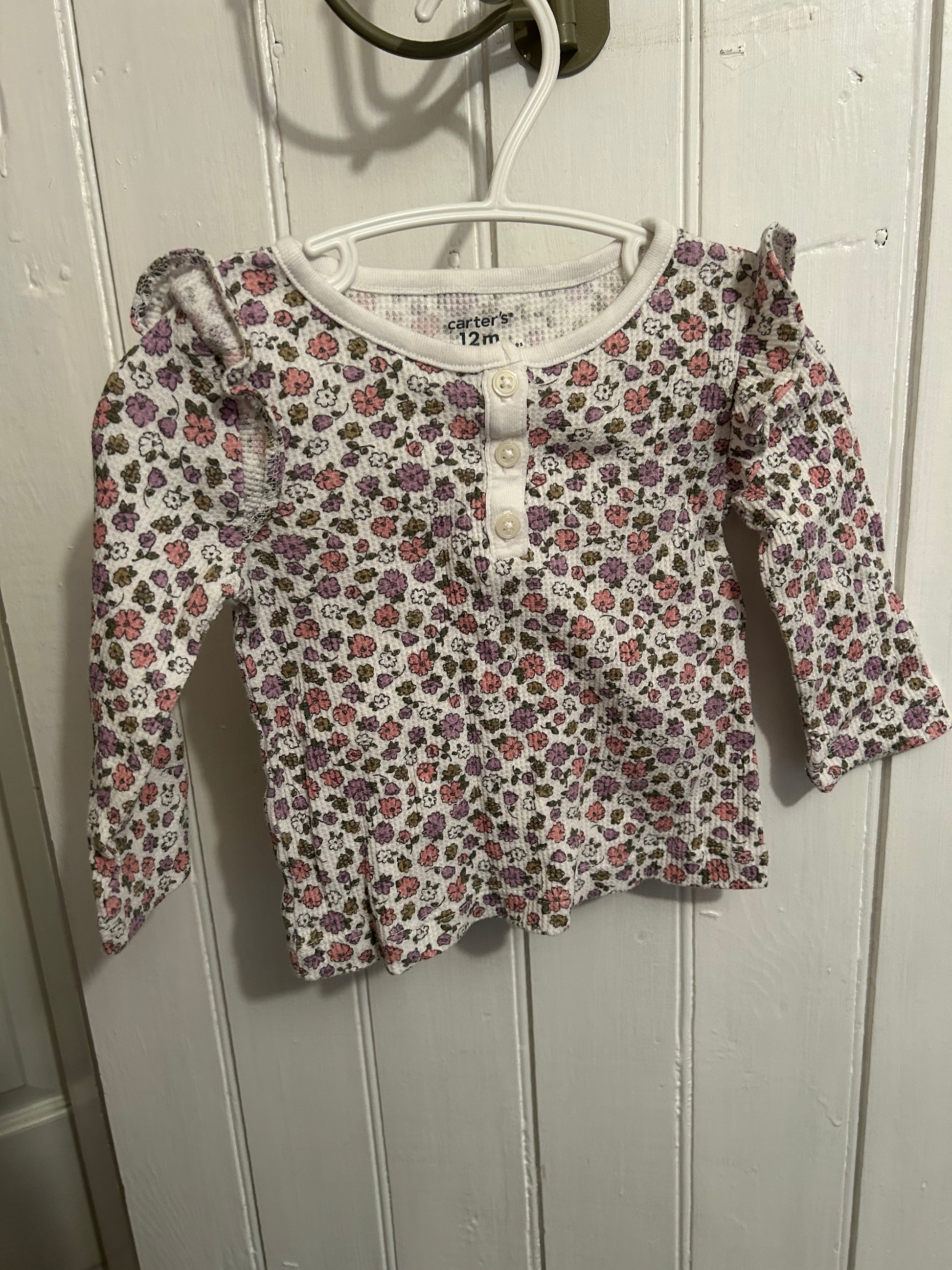 Carters brand. Long sleeve ruffle waffle knit top. White with pink & purple floral. Size 12m. Brand new conditionÂ