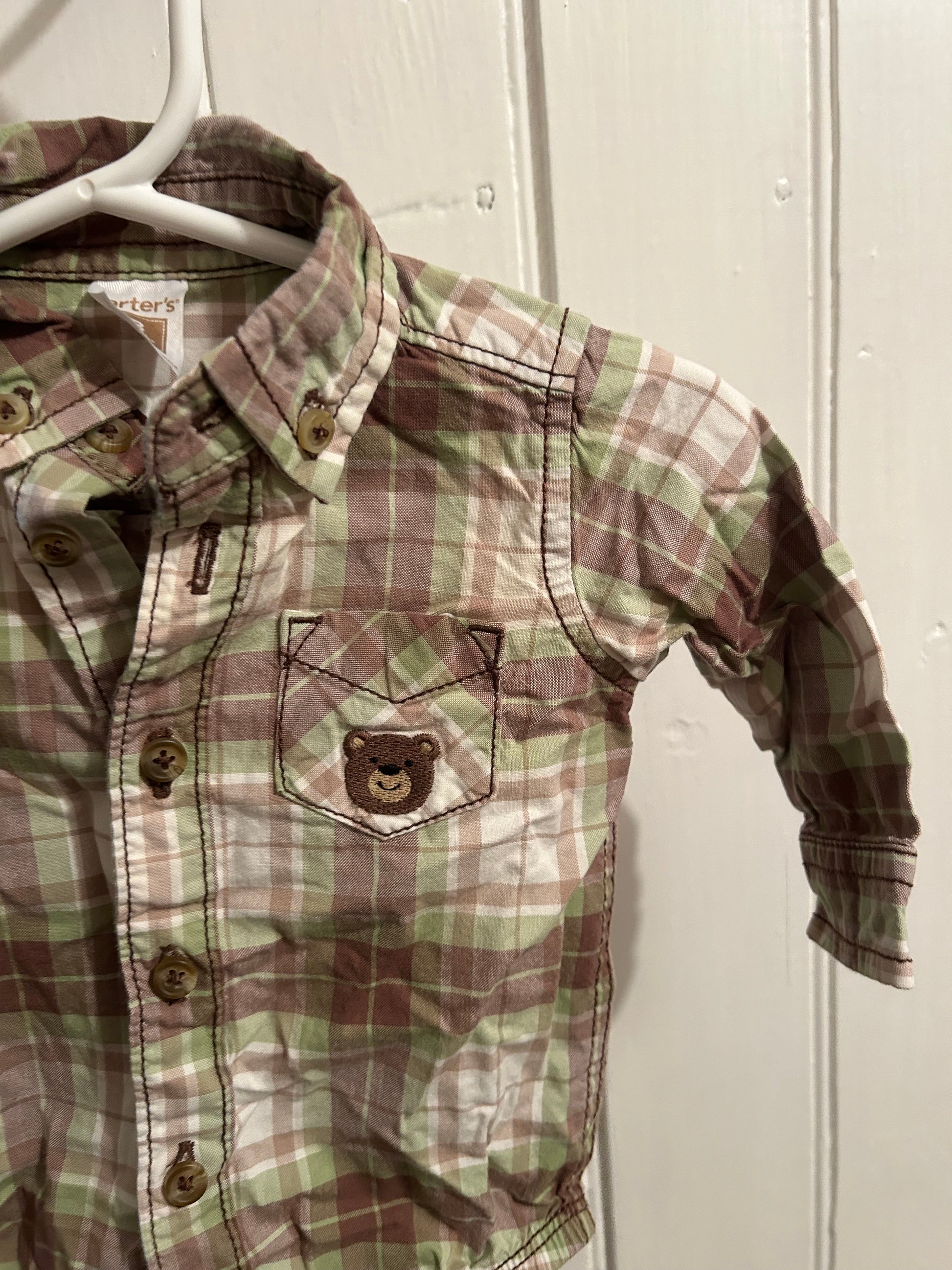 Carters brand. Long sleeve button up flannel onesie. Green & brown plaid. Size 3m. Brand new conditionÂ
