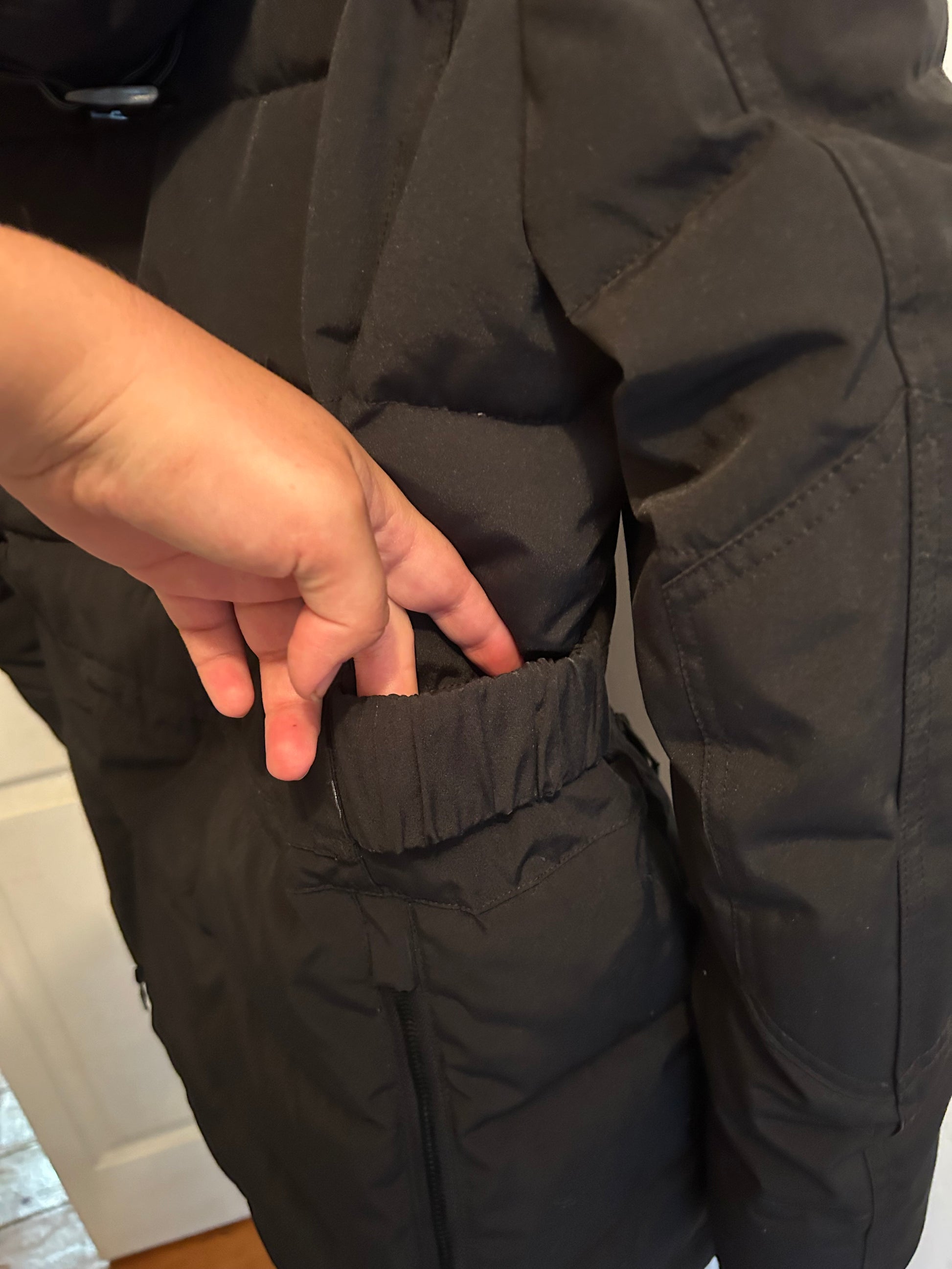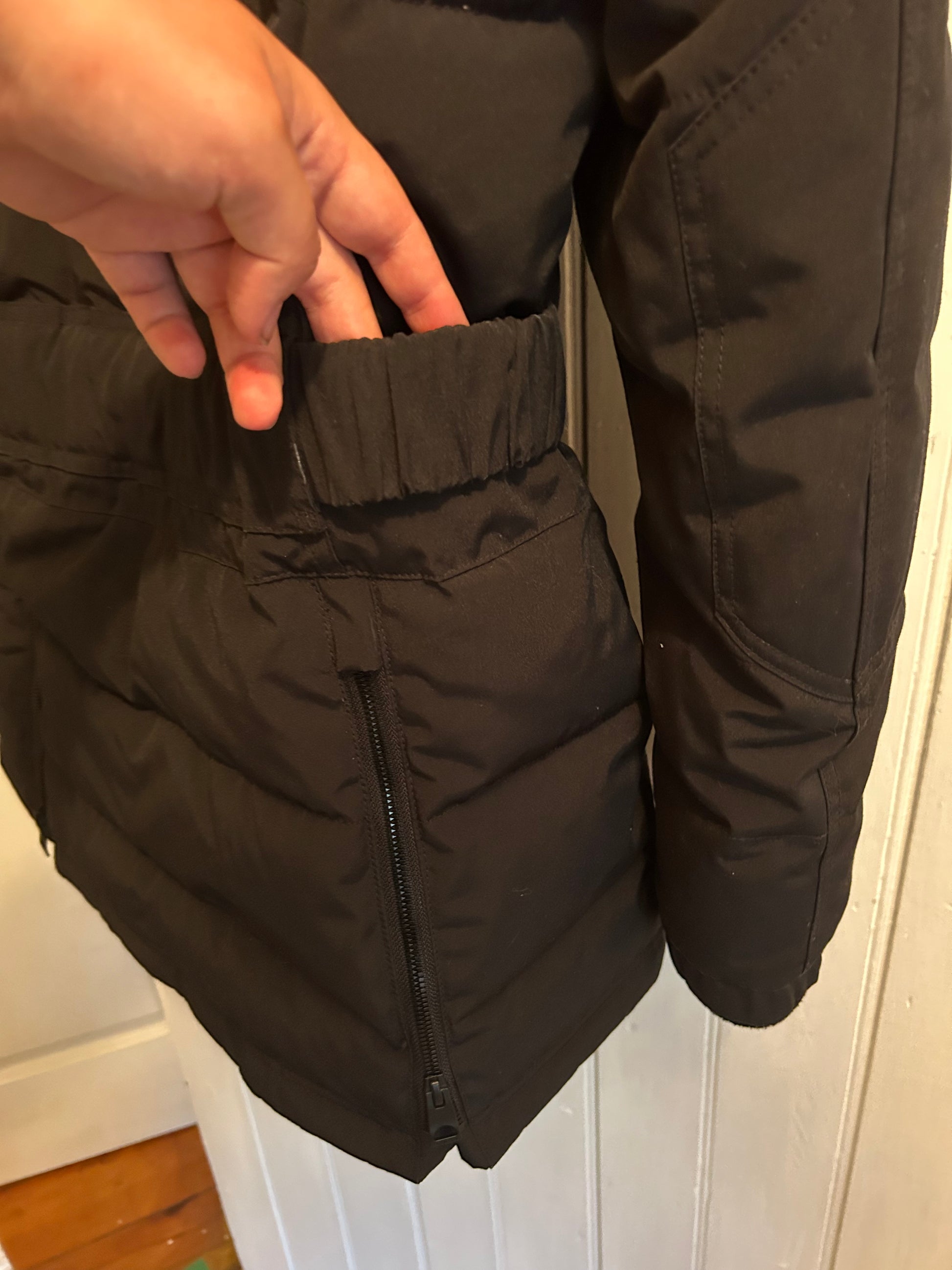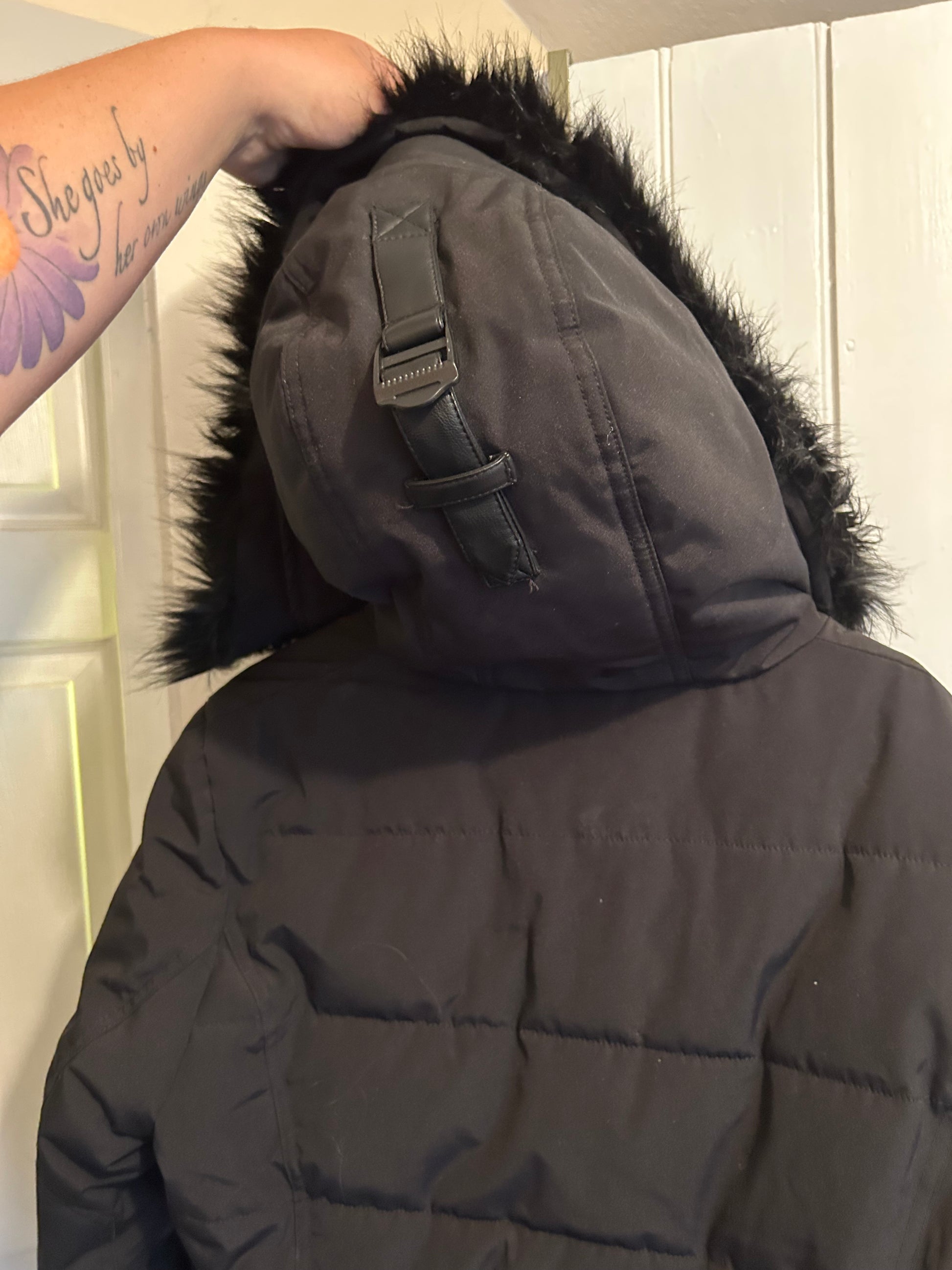 Guess brand. Zip up hooded winter jacket. Bum length. Stretchy side belts. Lots of pockets. Heavy weight, mostly lined with fleece inside. Black in colour. Size women’s xl. Brand new condition
