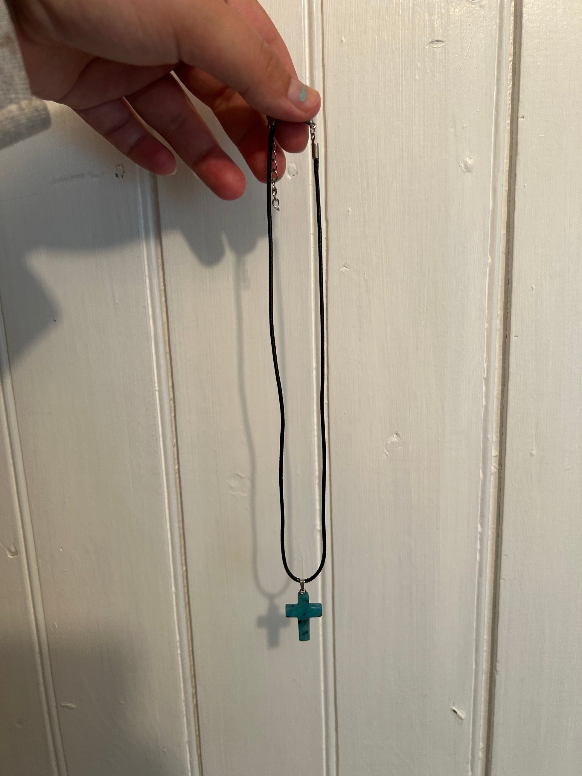 Handmade by local small shop, Kitty r designs. Teal gemstone cross necklace. Brand new