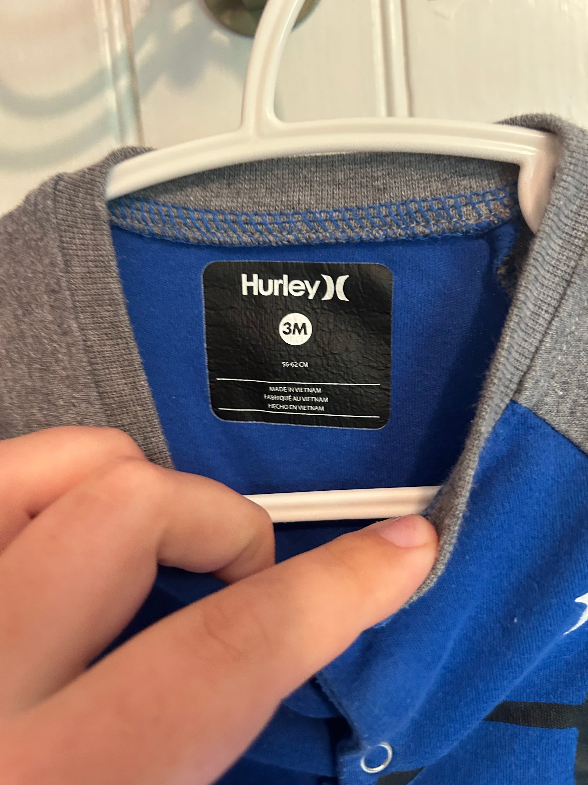 Hurley brand. Button up sleeper. Blue & grey shark print. Size 3m. Brand new condition