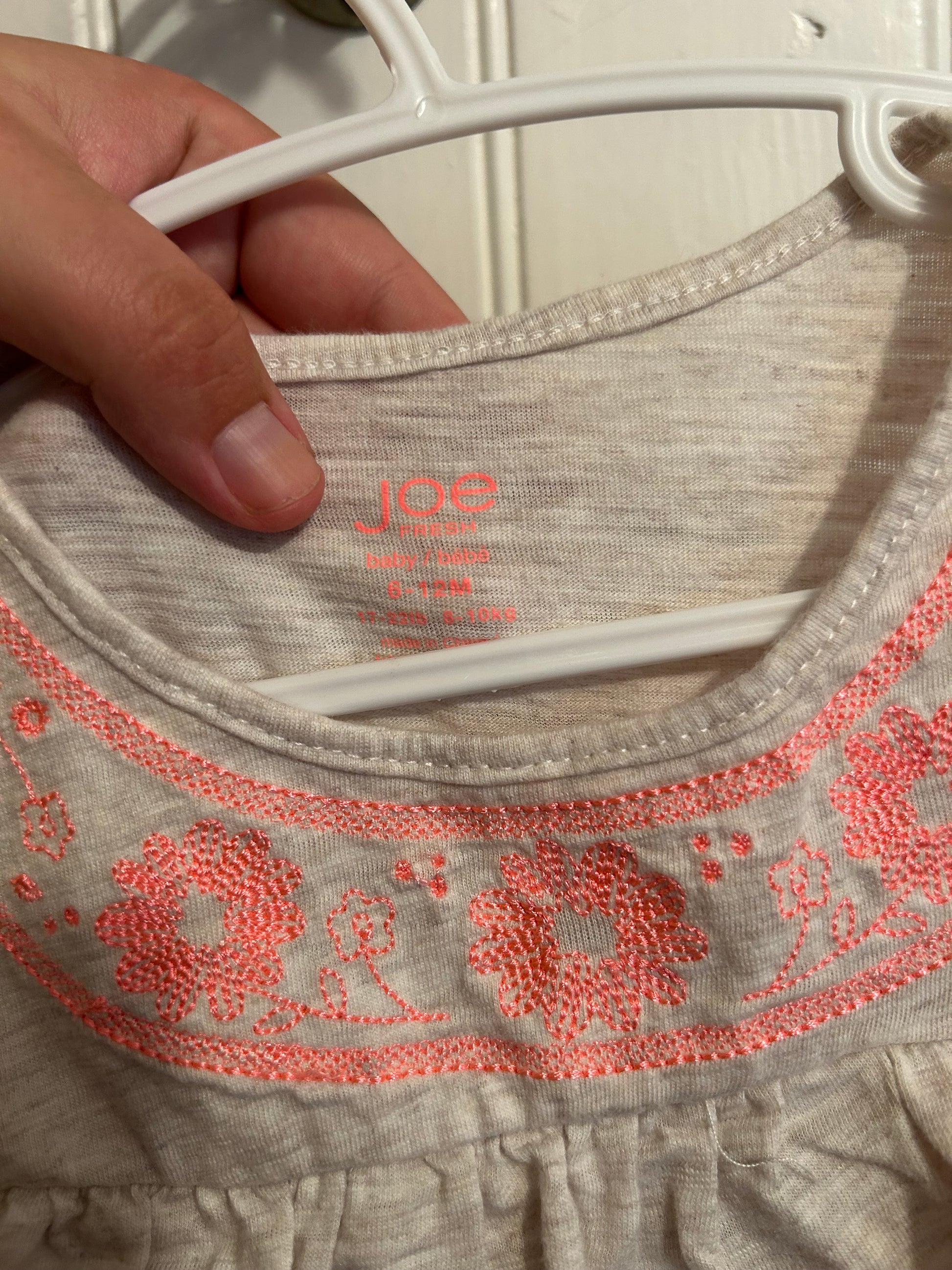 Joe fresh brand. Short sleeve ruffle top. Tan with pink embroidered neckline. Size 6/12m. Brand new conditionÂ