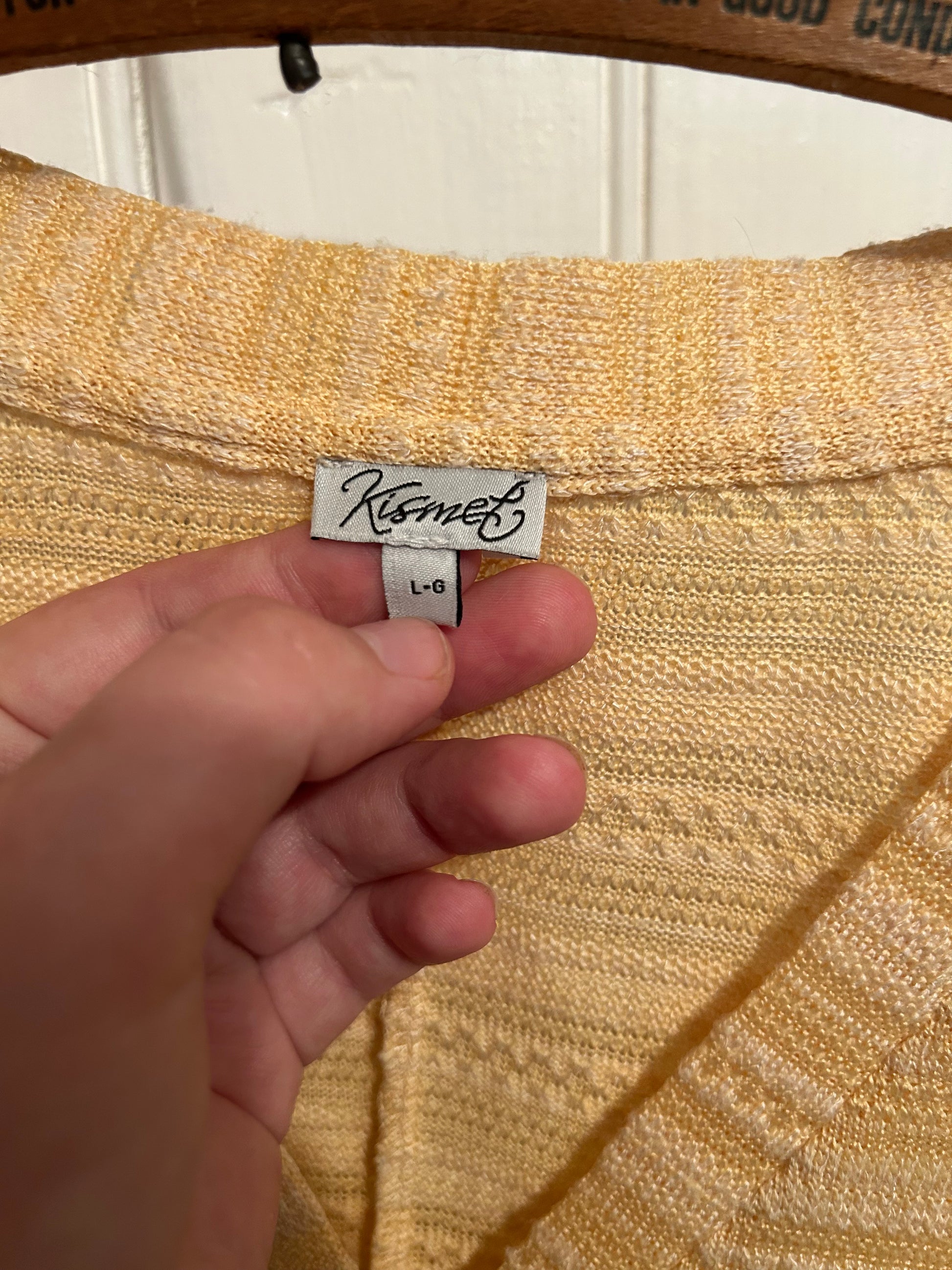 Kismet brand. Long sleeve vneck top; could be work as a top or cardigan. Yellow textured striped. Semi see through. Size large. Brand new condition