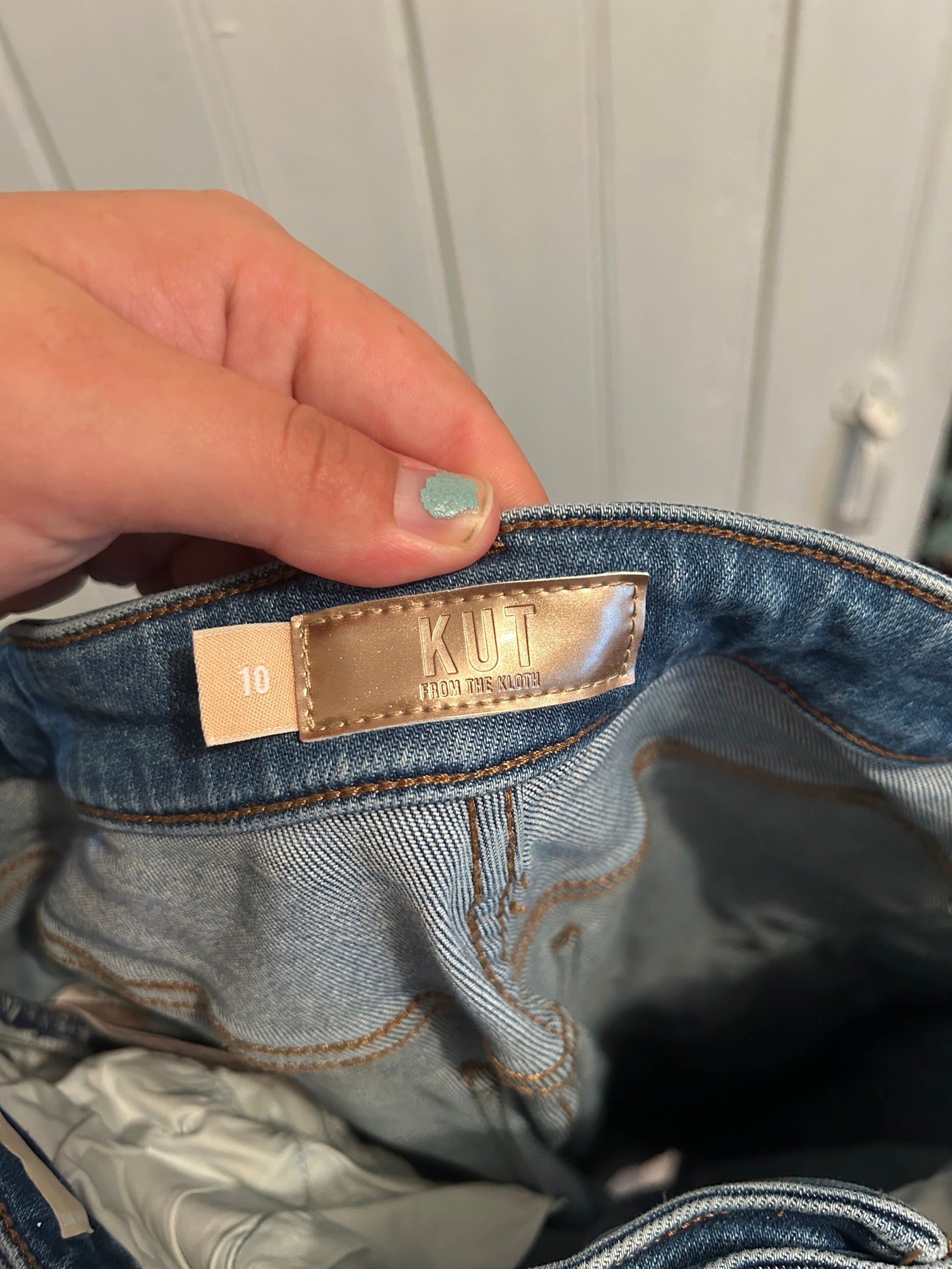 Kut from the kloth brand. High rise skinny jeans with raw ankle hems. Button up, no zipper. Size women’s 10. Brand new condition