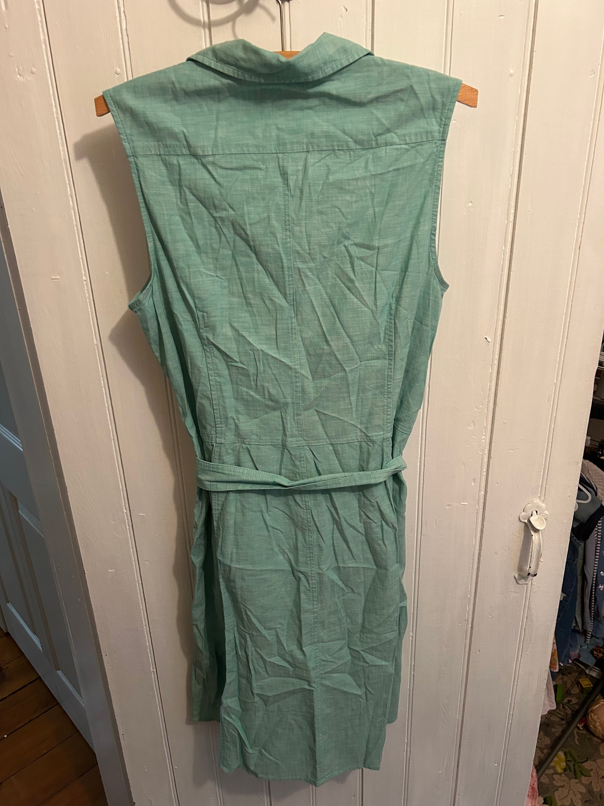 Lands end brand. Sleeveless button up midi dress. Adjustable tie belt. Teal in colour. Size women’s 12. Brand new condition