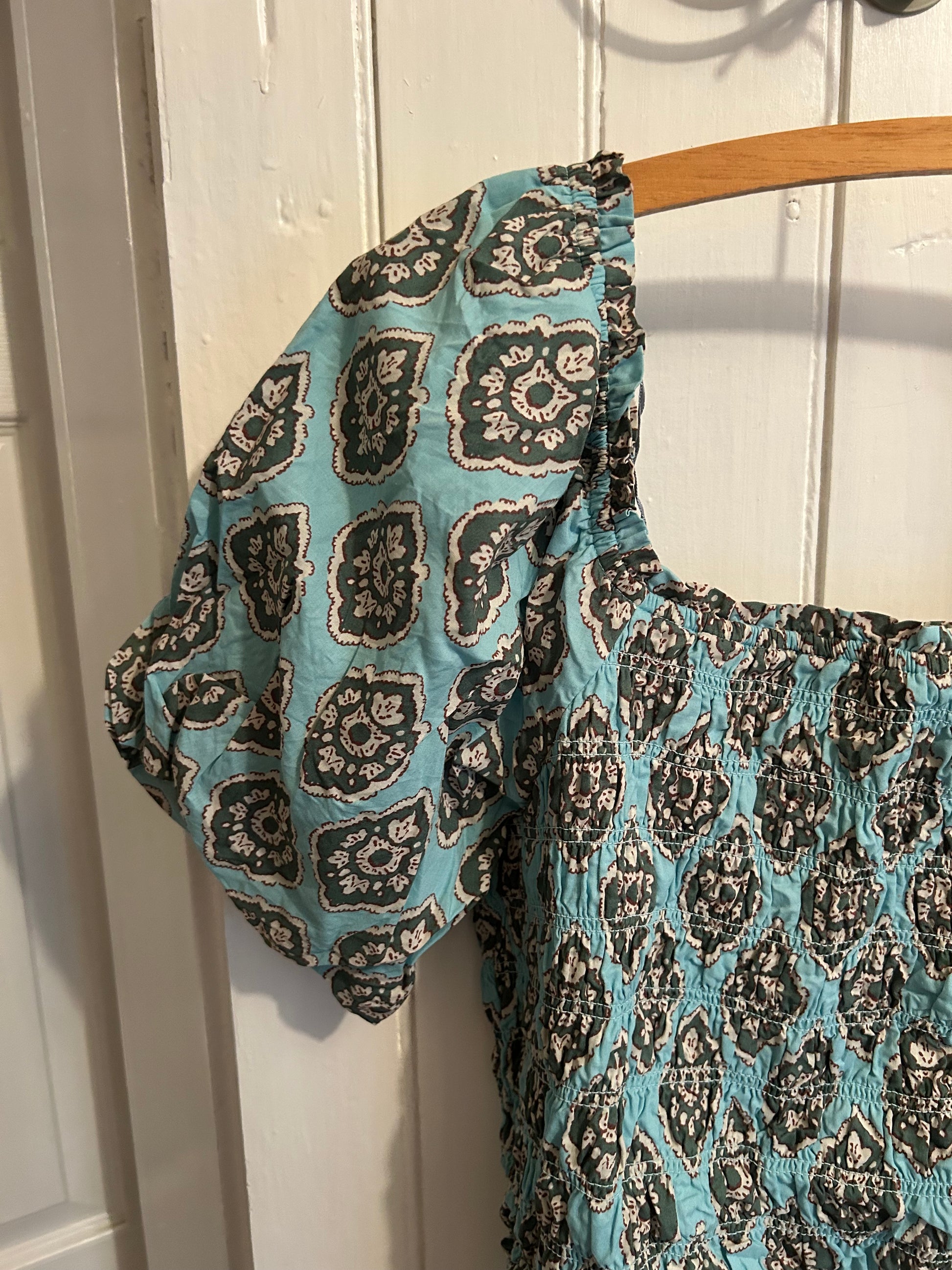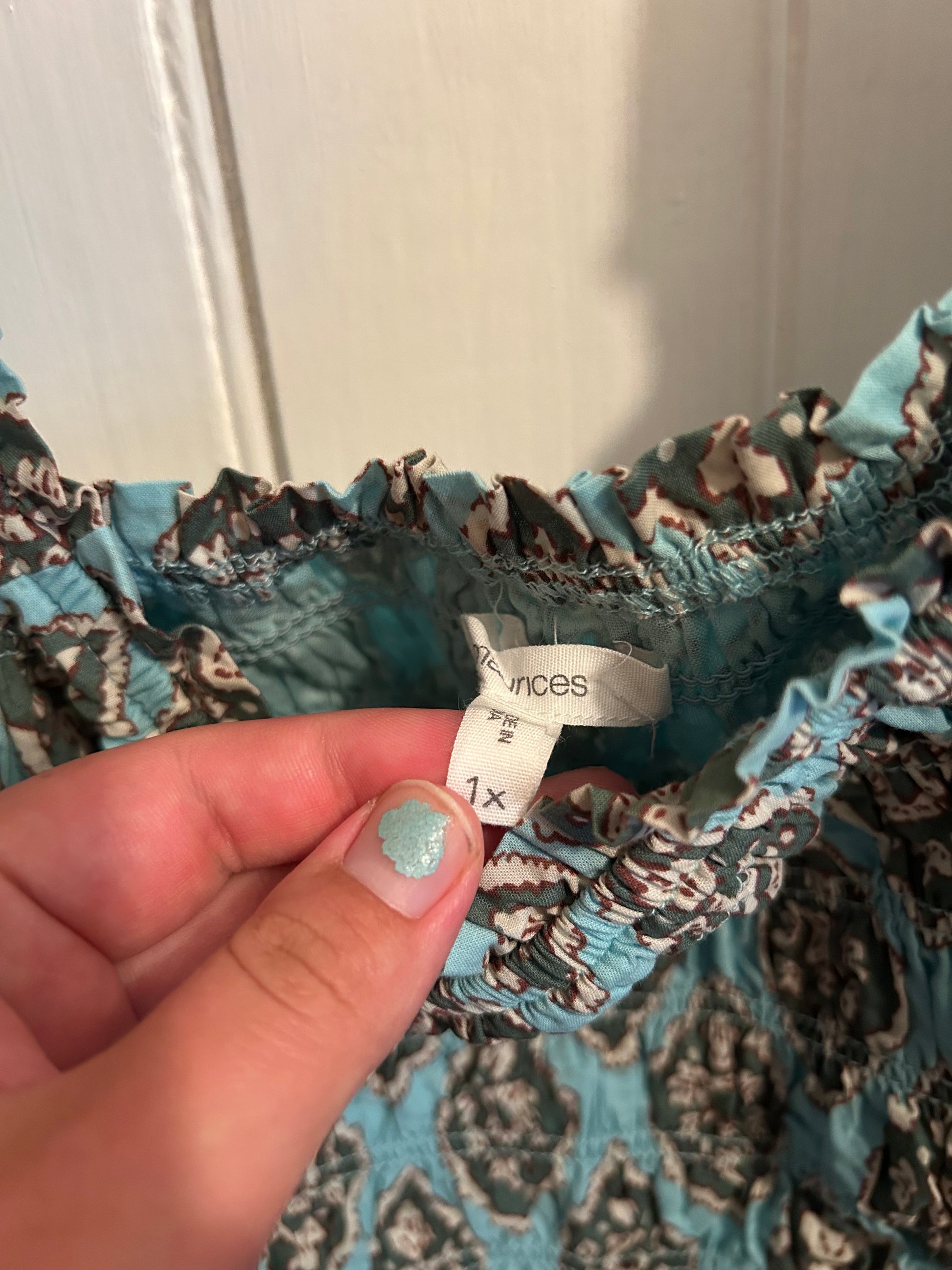 Maurcies brand. Short puff sleeve cropped scrunch top. Blue & green paisley print. Size 1x. Brand new condition