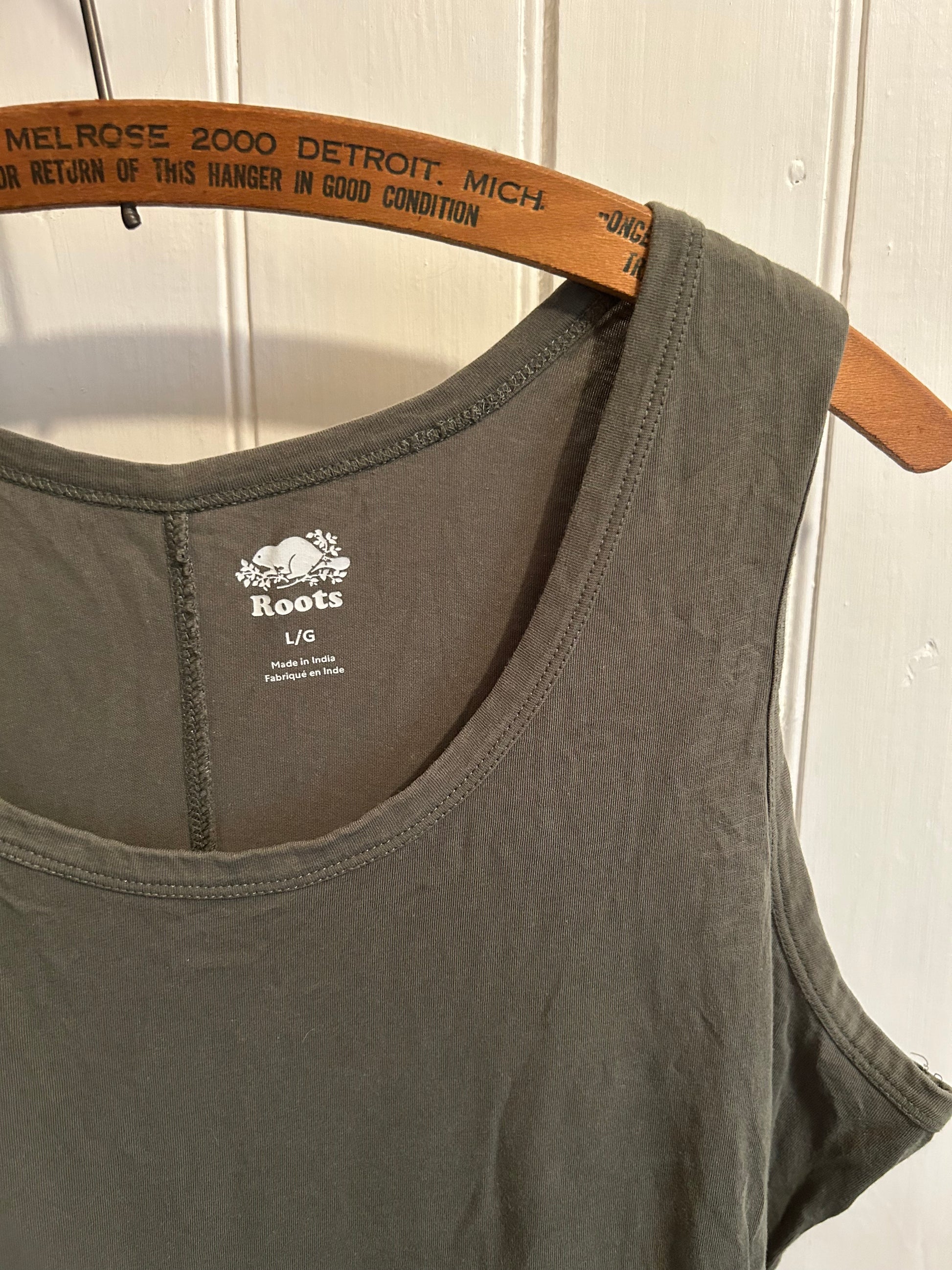 Roots brand. Sleeveless midi length shift dress with slits on both sides. Olive green in colour. Size large. Brand new condition